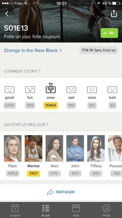 C’est le côté pratique de l’application. Mais cette application à d’autres fonctionnalités. Quand vous avez vu un épisode, on clique sur « vu », logique et vous pouvez ajouter si l’épisode était good, wow, bad et compagnie. Vous pouvez aussi, si cela vous dit, cliquer sur le personnage qui a été le plus cool dans l’épisode (et pas dans la série). Ce sont des choses futiles peut être mais que j’adore utiliser.